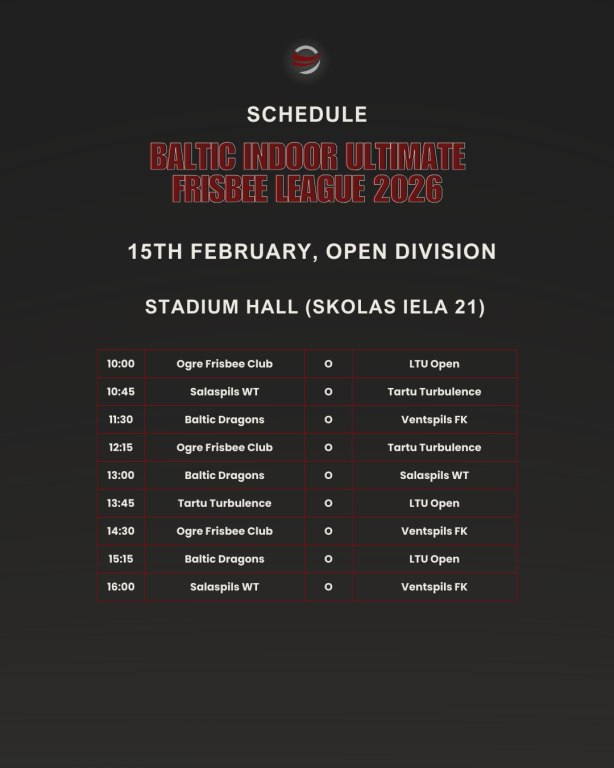 februārī laukumā dosies vīriešu divīzijas komandas – Ogre Frisbee Club, Salaspils WT, Baltic Dragons, Tartu Turbulence, LTU Open un Ventspils FK.