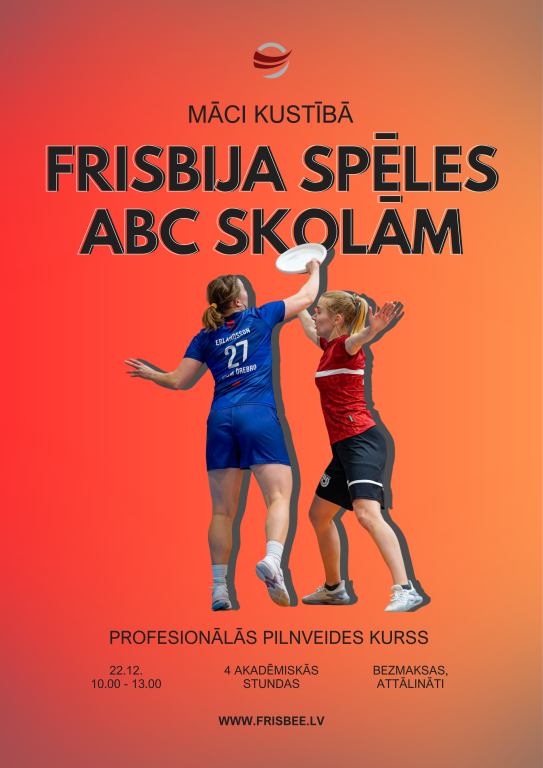 Aicinām pedagogus, trenerus un sporta nozares speciālistus piedalīties profesionālās pilnveides kursā “Māci kustībā: frisbija spēles ABC skolām”, kurā praktiski un vienkārši iepazīstināsim ar frisbija spēles pamatiem, noteikumiem, piespēlēm, mācīšanas metodēm un kustību aktivitāšu integrēšanu mācību vai treniņu procesā.