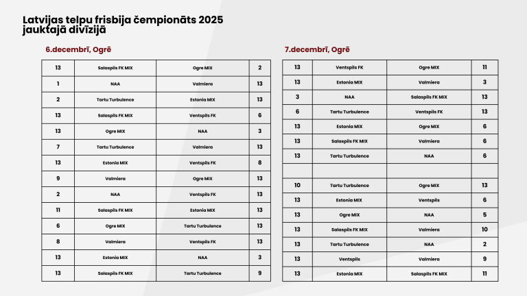 6. un 7. decembrī Ogrē norisinājās Latvijas Telpu frisbija čempionāts jauktajā divīzijā 2025, pulcējot komandas no Latvijas un Igaunijas. Divu dienu garumā skatītāji baudīja intensīvas un spraigas spēles, kur katrs punkts varēja izšķirt vietu kopvērtējumā.